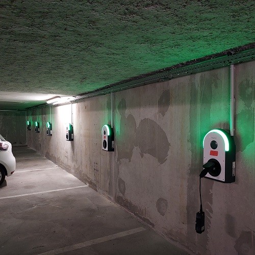 À la demande du client, les bornes installées sont des Schneider Electric EVlink Pro AC, reconnues pour leur fiabilité et leur performance.